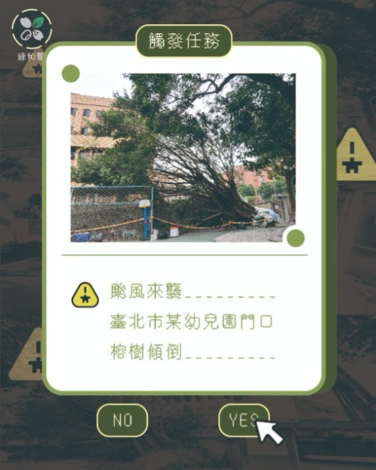 臺北市某幼兒園門口的榕樹,去年(2024年)因颱風侵襲而傾倒在建築物上。