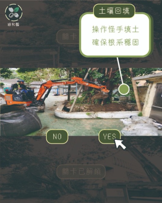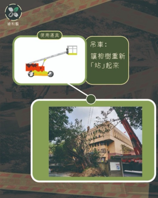 首先把因傾倒而壓迫受損的枝條修剪清理,接著配合吊車讓榕樹重新「站」起來,並於樹周圍立支架,最後出動怪手回填土壤……原先奄奄一息的榕樹,再次綻放在天空之下。