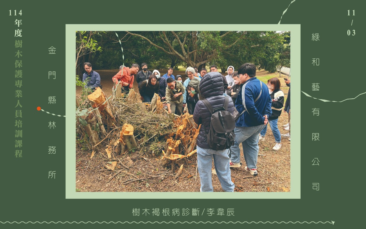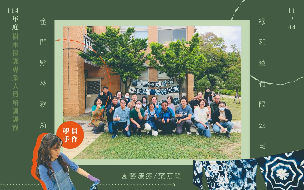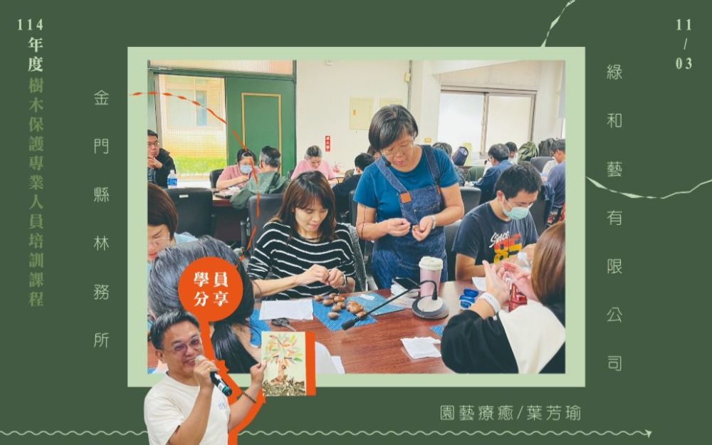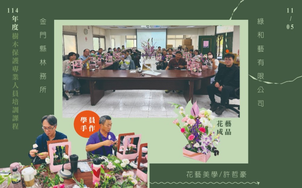 還記得去年我們協助金門縣林務所辦理研習課程嗎? 時光荏苒、歲月婆娑,再次迎來今年「114年度樹木保護專業人員培訓課程」之日。 今年11月初,我們邀請深造於綠美化的各方專業講師,從臺灣千里迢迢飛至金門授課,為學員們帶來連續3日紮實的課程內容。 這回於課程規劃上,不但具備樹藝學的理論實務,相較於去年,另安排園藝療癒、花藝美學的應用手作課程。 #講師群春風化雨 #學員們心靈手巧 課程強化學員的樹藝專業學識,也富足了身心靈上的美感體驗。課後學員們綻開笑靨,攜了充裕的知識和別緻的作品返鄉。
